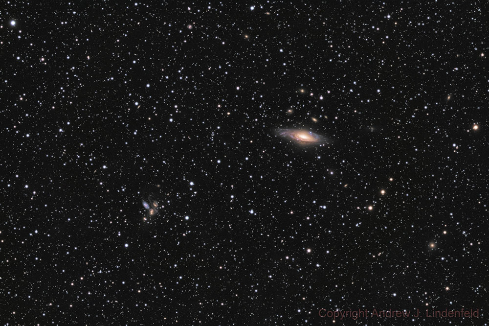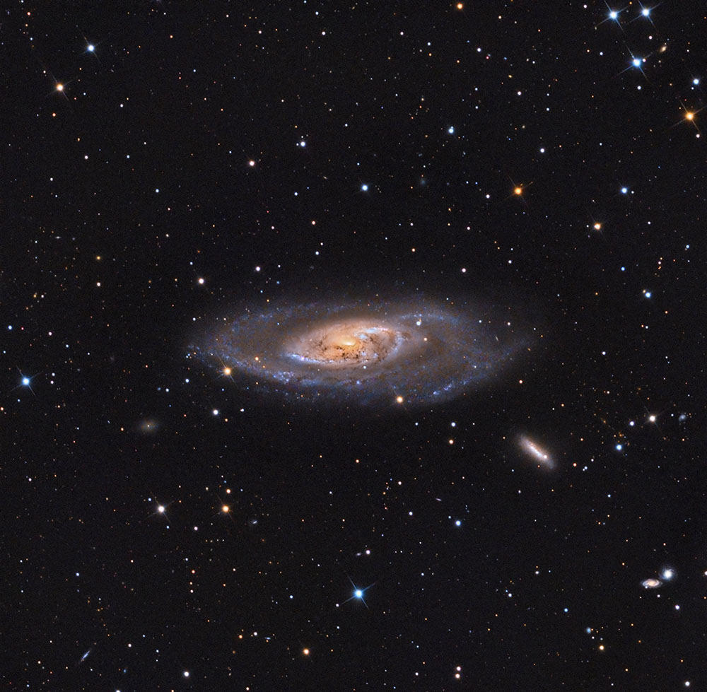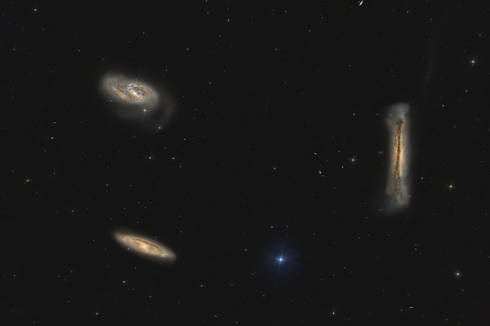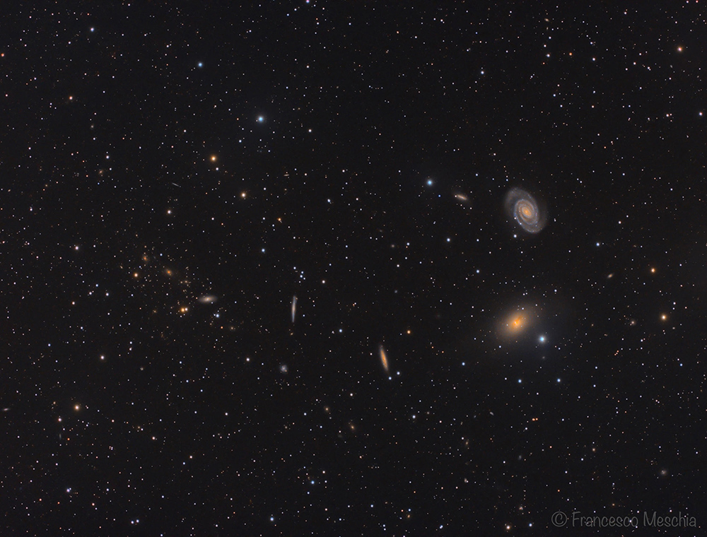 NGC 5364 is a "grand design" spiral galaxy found in the Eastern part of the constellation Virgo, over 50 million light years away from us. In this image it is accompanied by a few other elliptical and spiral galaxies located between 40 and 70 million light years away, but also by the galaxy cluster Abell 1809, that sits at over 1.1 billion light years of distance. Abell 1809 is visible in the left portion of the image, about halfway from the top, and looks like a cluster of faint, yellow stars... until one zooms in to full resolution and sees that the "stars" are actually small fuzzy galaxies, almost 20 times farther than the foreground galaxies.