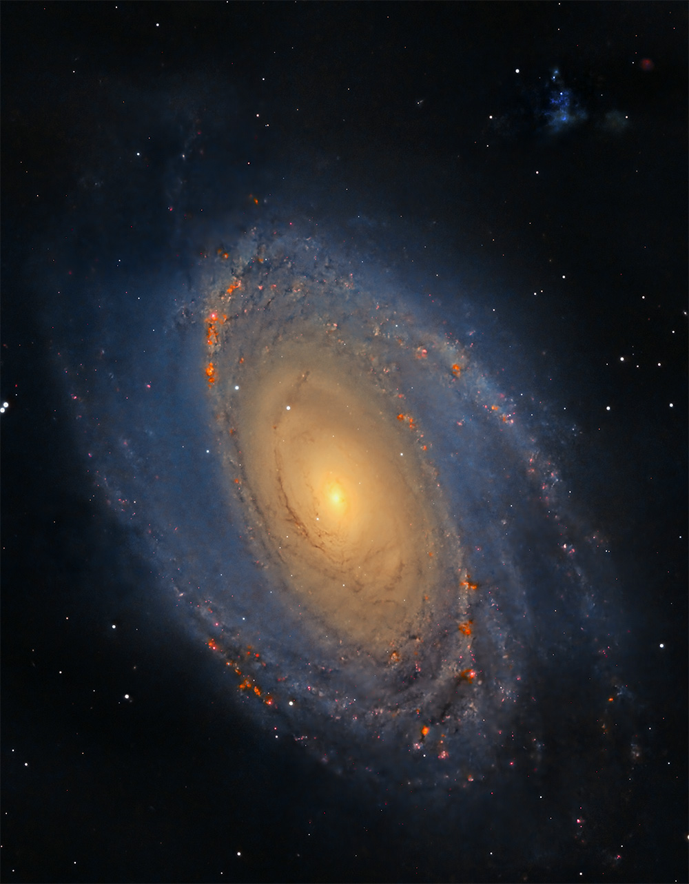 Bode's Galaxy, also known as Messier 81 (M81), is a grand-design spiral galaxy located about 12 million light-years away in the constellation Ursa Major. It features well-defined spiral arms filled with young, hot stars and glowing regions of star formation. M81 is one of the brightest galaxies in the night sky and is easily visible through small telescopes. I captured it via Celestron 9.25EdgeHD and ZWO ASI2600mm pro, Antlia L, R, G, B and Ha 2.5nm over Sky-Watcher EQ6RPro. 29 hours of 120s (LRGB) and 300s (Ha) exposures. Shot from bortle 7 backyard and processed in Pixinsight.