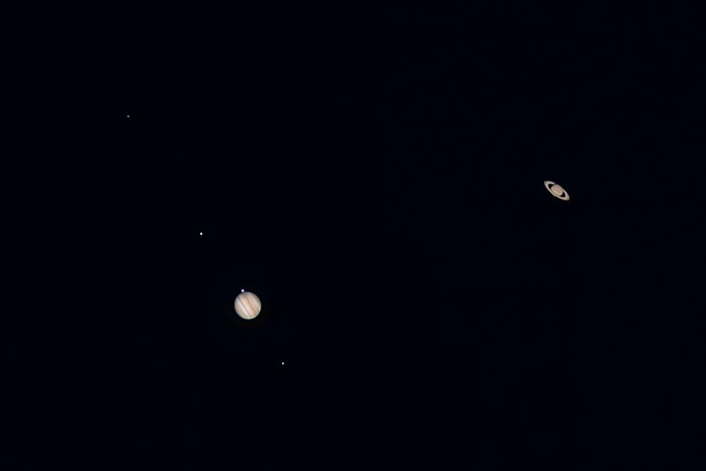 This HDR image of Saturn (magnitude +0.6) passing 0.1° west-northwest of Jupiter (magnitude -2.0) was taken from my backyard in Houston, Texas about 32 minutes after sunset (17:59 CST) on 21 December 2020. Last time the two planets were this close in angular separation was on 17 July 1623, and next time will be on Ides of March 2080.