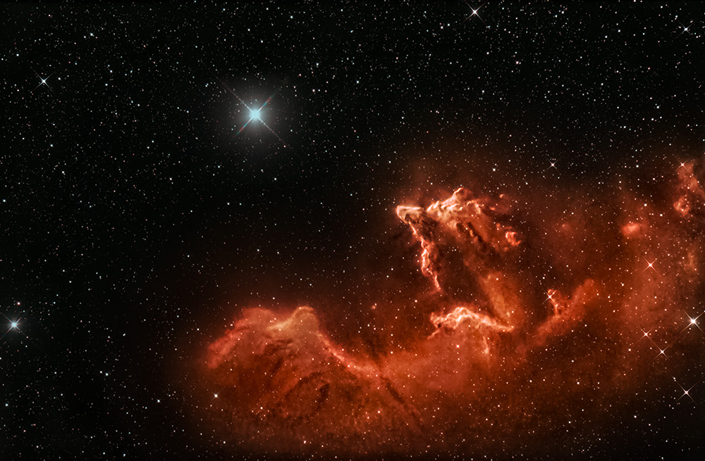 The final image is much brighter than most "ghost" images I've seen. My reasoning here was that as I stretched the data there was so much detail in the head (IC 63) that I wanted to get as much as possible without blowing out the highlights. I also decided to keep Navi (gamma cass) in the shot; it just looks like the nebula is reaching out toward the star!