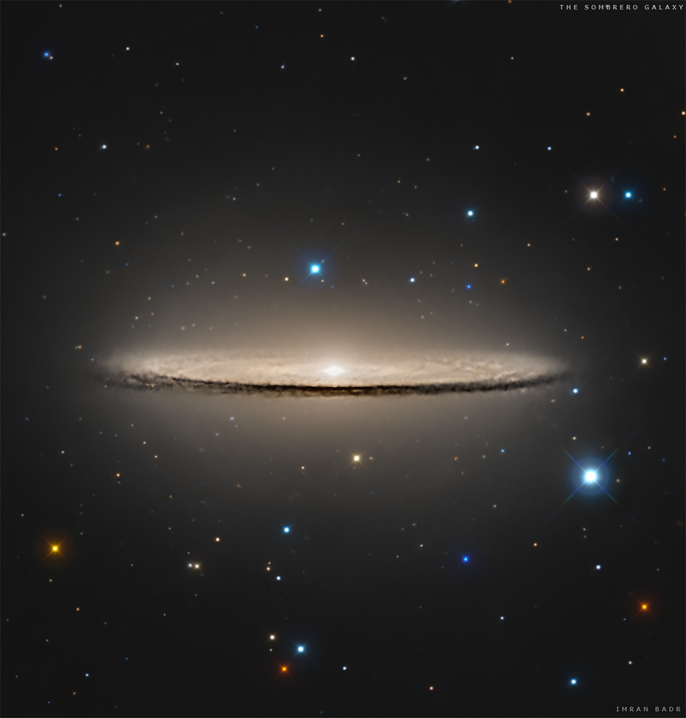 The Sombrero Galaxy (M104) is one of the most striking looking spiral galaxies. It has a large central bulge, a bright nucleus, and spiral arms which pass through thick dust lane. It is edge-on to our seeing. The Sombrero Galaxy can be found in the constellation of Virgo. It's estimated distance from Earth is 29 million light years.
