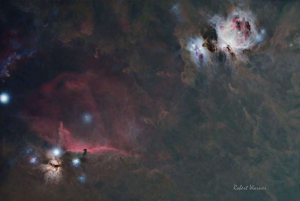 This months photo arrives from Del Rio, Texas and shows the dense nebulosity of Orion, Horsehead, and Flame nebula as well as the surrounding area. Additionally, the removal of stars in the image field gives us a new perspective of this popular area of the sky. Thank you so much to Robert for sharing this photo!