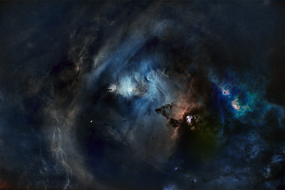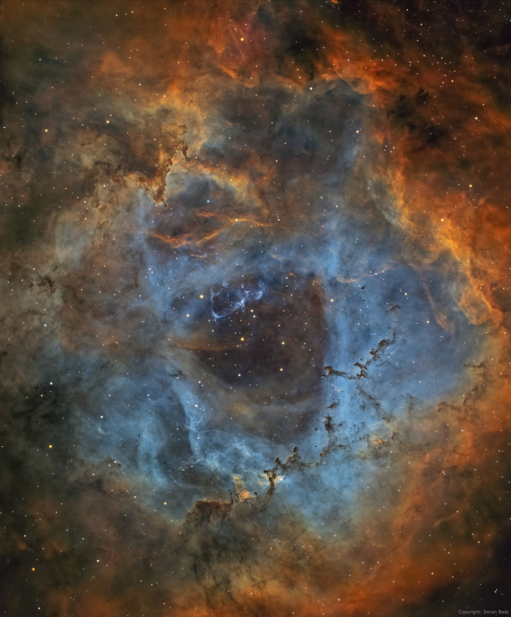 The Rosette Nebula (NGC 2237/8) is a well-known and popular emission nebula in Monoceros, located about 5,200 light-years away, with its central cluster NGC 2244 exciting the surrounding gas to create its iconic glowing structure. This image looks deeper into the Rosette nebula and shows structures with clarity and detail. This is a crop of a little wider field of view. For this image, I combined data from Nov 2022 from a one-shot color camera with dual-narrowband filter and latest data from Jan 2025 using a mono camera with 3nm S,H and O filters.