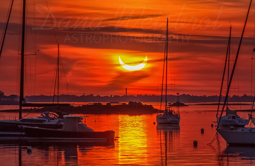 I shot this photo at 5:28 am, June 10th, from a private beach on Bell Island in Rowayton, Connecticut. Since the Sun would be very low to the horizon at maximum eclipse I had originally planned on shooting from the top floor of a parking garage situated high on a hill, however, a few days before the tenth, I remembered the beach that I had previously shot Comet Neowise, and thought it may be better. I drove down to the beach with my trusty compass to check if the Sun would be rising in the right location. It seemed like it should work, but I wasn't positive. The morning of the tenth I left my house at 4:55 am, and started to drive to the beach, but I wasn't sure I was making the right choice. When I got there, I could see where the pre sunrise glow was coming from and it looked to be good. I set up my tripod on the beach and took a rough guess of the exposure settings. When I realized the Sun was breaking above the horizon I started taking a lot of shots at varying exposures. I was very nervous that I would blow my opportunity since the Sun was rising quickly. As the Sun was rising I had to keep moving the tripod to the left to keep the Sun positioned between the boats and had to constantly adjust the exposure settings since the Sun was getting brighter. There were a lot of clouds around and I wasn't sure how my photos were coming out, but in the end I got several nice shots.