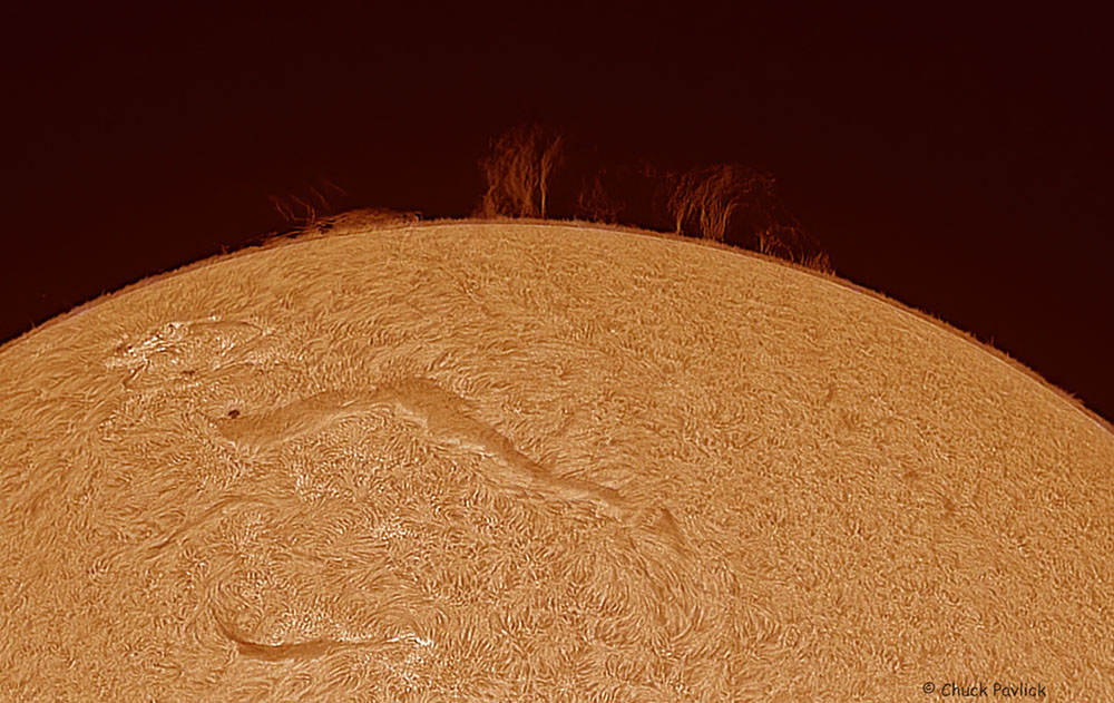 It seems fitting that the winning photo during the month of summer solstice is an incredible capture of the sun and the filaments reaching from the surface. Chuck captured this photo from South West Florida. Here are the details.