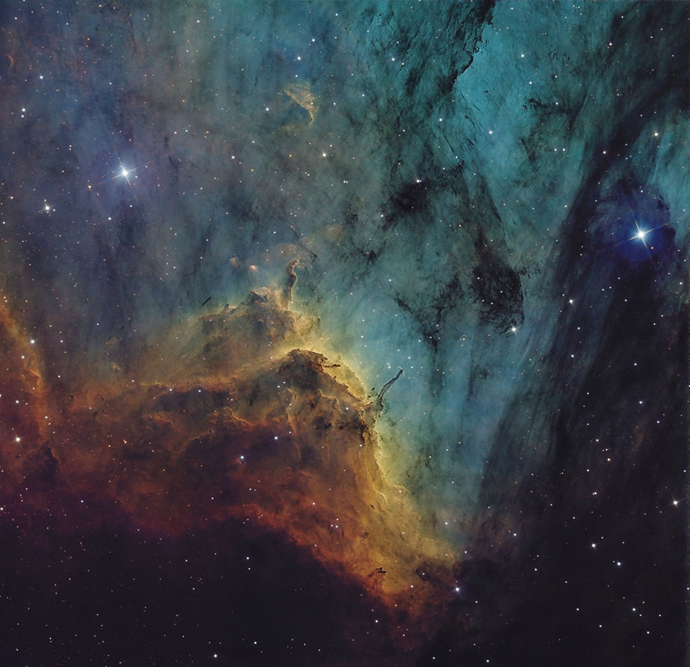 Acquisition was done with NINA, and the raw images were stacked in AstroPixelProcessor. The resulting images were processed with Photoshop CC in the "Hubble Palette", where Sulfur is assigned to the red channel, Hydrogen to green, and Oxygen to blue.