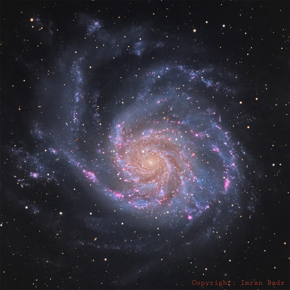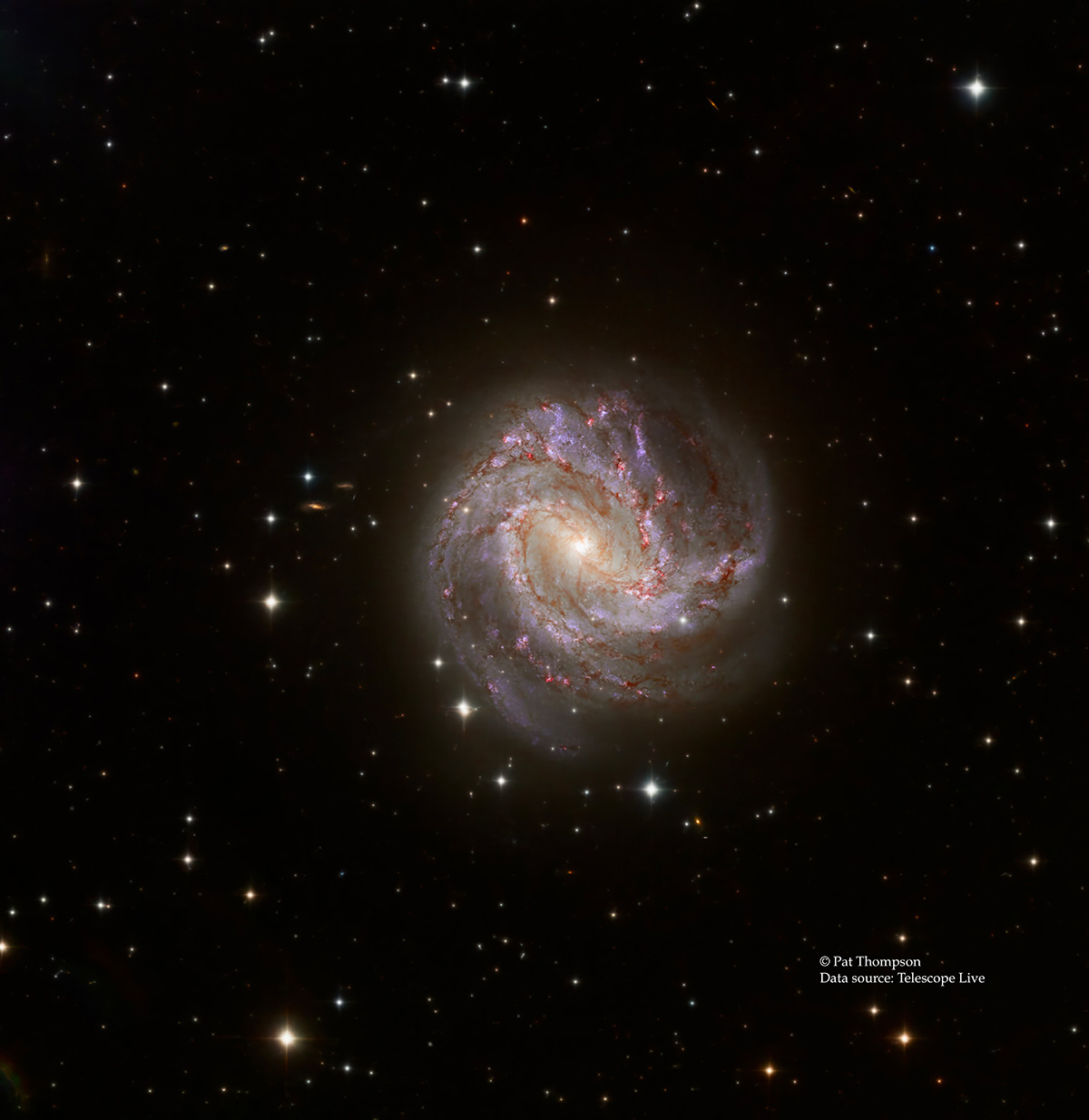 Messier 83, the Southern Pinwheel Galaxy. Approximately 15 million light years from Earth in the constellation Hydra. With a diameter of 55,000 light years it is about half as wide as the Milky Way. It has very active star formation in its core and arms. M83 is a captivating galaxy that offers significant insights into the workings of barred spiral galaxies and the processes governing star formation and galactic dynamics. Its accessibility and the wealth of visible detail make it a key object of study and observation in the field of extragalactic astronomy.