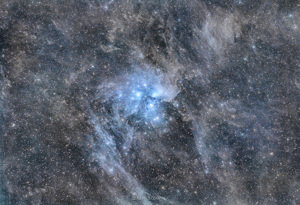 I took this photo in Yucca Valley, near Joshua Tree, California, aggregating over a hundred 3-minute sub-exposures (5 hours total exposure time) over the course of 3 nights (9/8/22 - 9/10/22). I then stacked all the sub-exposures via stacking software (Astro Pixel Processor), and edited in Photoshop to produce the final image. With darker skies (bortle 4) and a fast lens (I had it at F2), I was able to capture some of the fainter dust surrounding the "Seven Sisters" - something I've never really attempted before from my apartment in the city.