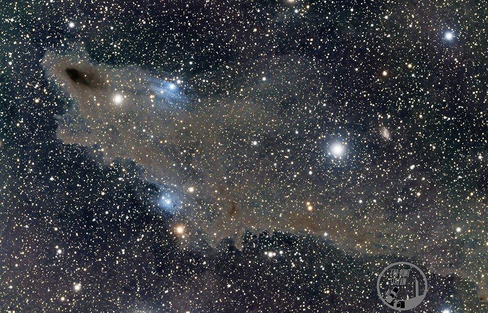 This month's APOM comes to us from Aneroid, Canada. The Dark Shark Nebula (LDN 1235) can be found swimming in the constellation Cepheus. The large molecular cloud blots out the stars behind and contains two blue reflection nebulae, vdB149 and vdB150. Below are the acquisition details from Stan Noble.