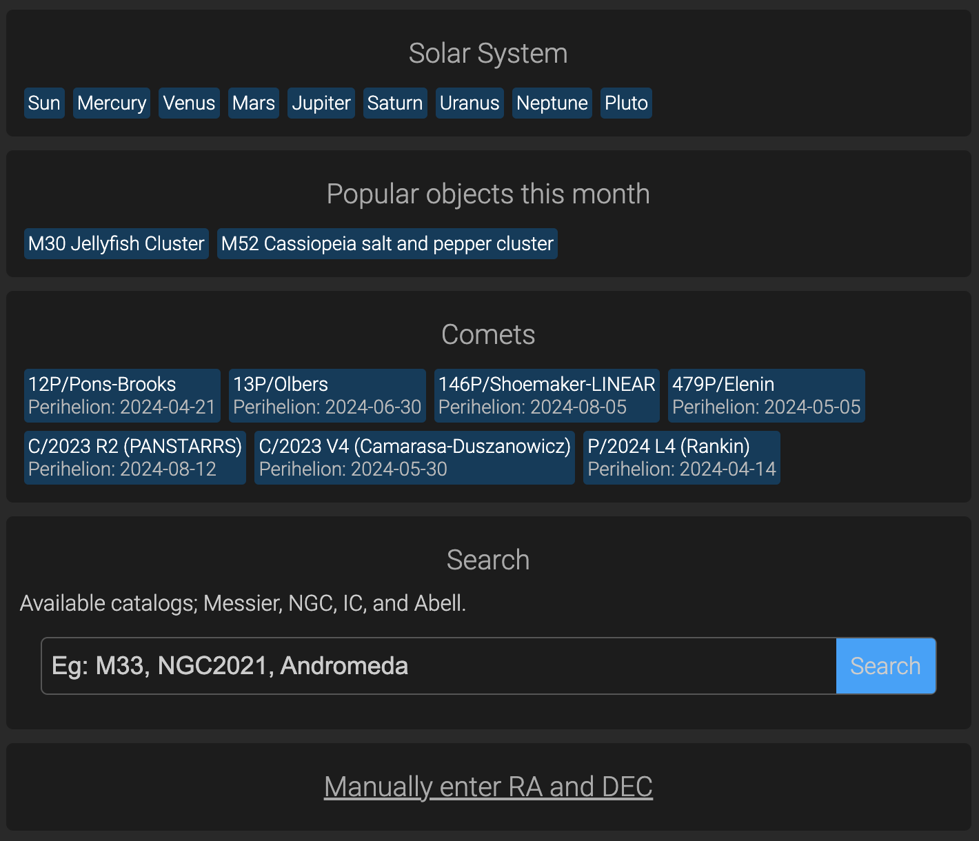 It is also possible to manually enter a Right Ascension and Declination of an object in the case Astrospheric's database is missing the data.
