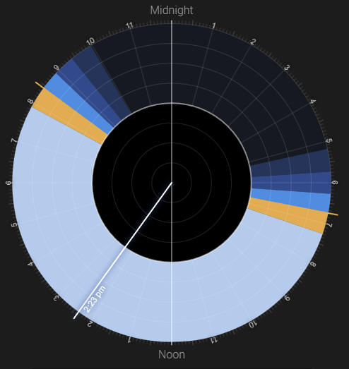 Unlike a traditional 12 hour clock, the Astronomical Clock contains all 24 hours in the day. Midnight is always at the top, and Noon at the bottom. The current time is indicated by a single white hand. The backdrop of the face is colored based on the various phases of the day caused by the Sun's altitude. The phases of the day are calculated for your exact forecast location.