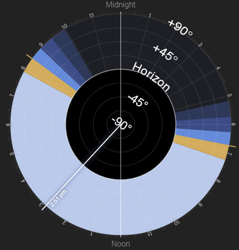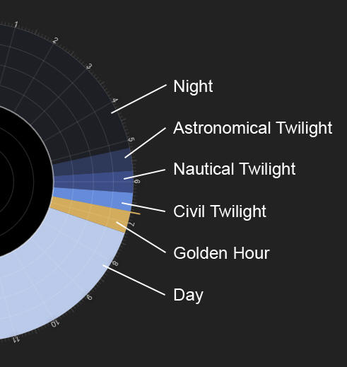 In addition to the phases of the day, the distance from the center of the clock dial indicates the altitude above or below the horizon.