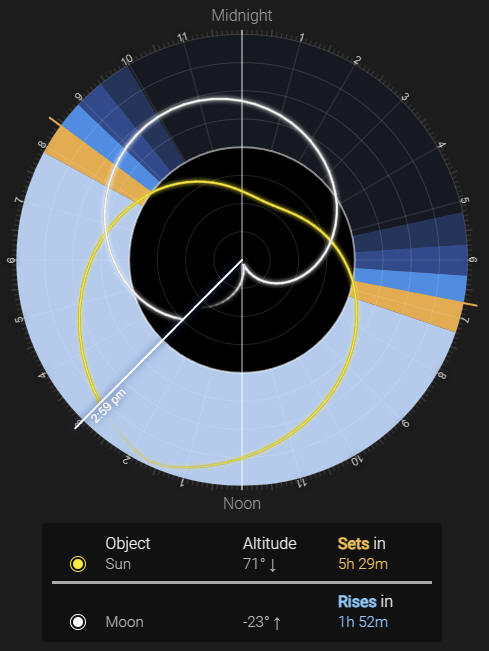 When an astronomical object has been added to the clock, its altitude relative to time will be plotted onto the clock with the path emanating from the current time hand. In the example below, the Sun and Moon are now plotted on the clock making it easy to see their altitude over the next 24 hours. When the object's path crosses the horizon indicates when that object will rise or set.