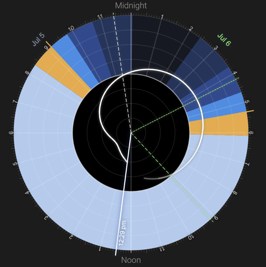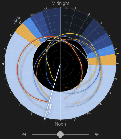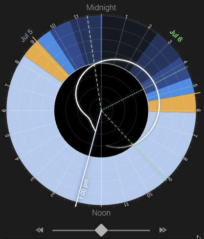 Remember, the clock face shows the next 24 hours of events from the current time indicated by the time hand. Event Lines turn green when they occur on a different date than the time hand's current date. The example image above shows that the Moon will rise on July 5th at 11:25PM, conjunction will occur a bit after 4:10AM on July 6th, and the Moon will set around 9:10AM July 6th.