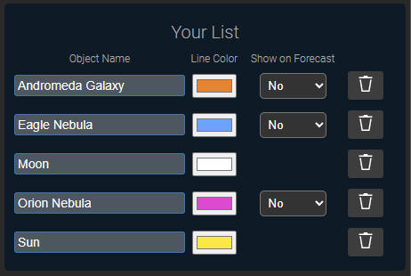 You can easily change the name and color of an object. Additionally you can chose if that object should show on your forecast timeline. Adding an object to your forecast allows you to quickly see if it coincides with good weather, as well as its alignment with the moon phase. In the example below, the Lagoon Nebula doesn't rise very high and I'll need to wait until a new moon before imaging.