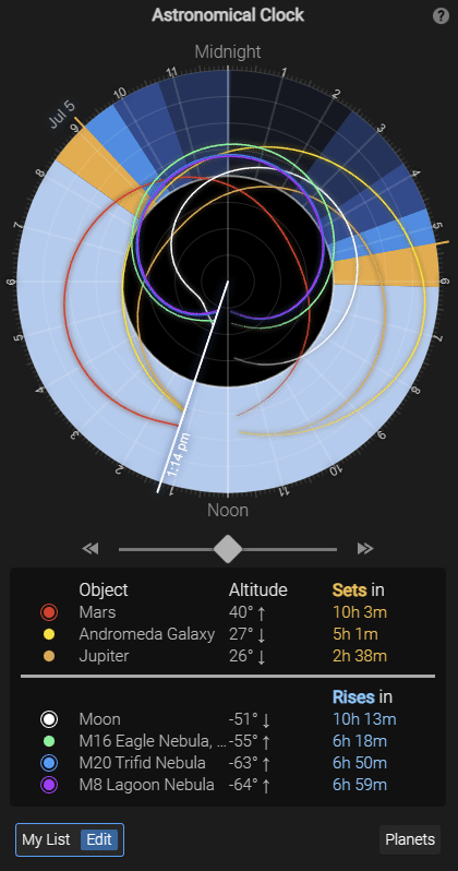 Each astronomical object on the clock can be highlighted to show more details and Time-Warped into the future (or past) to see when it's most advantageous to observe.